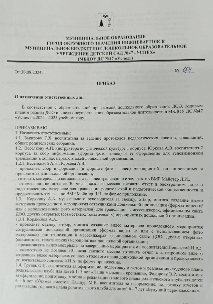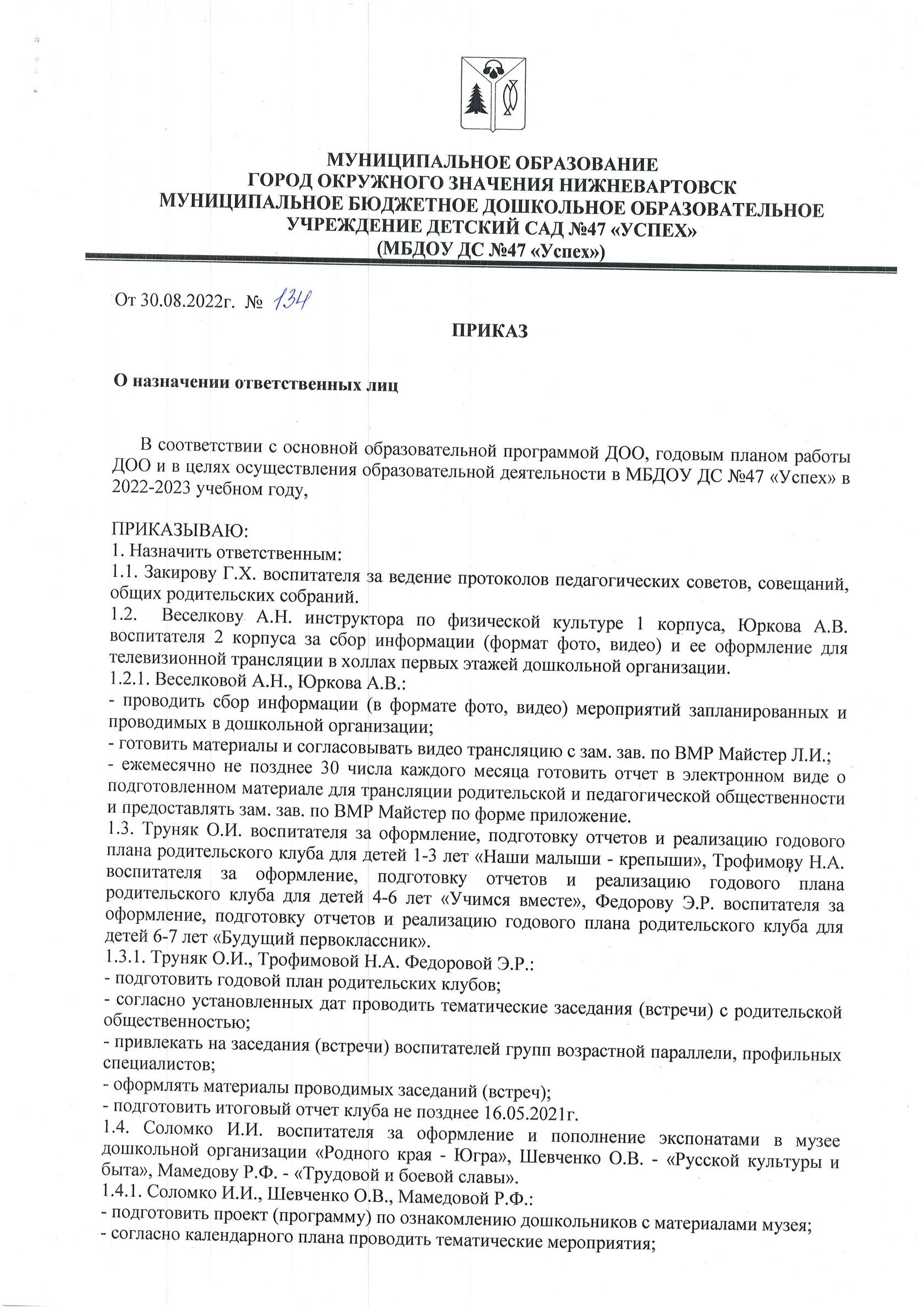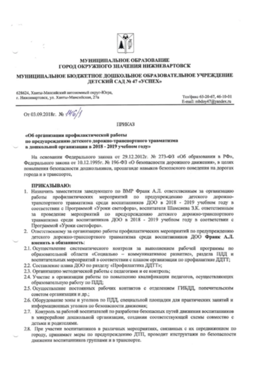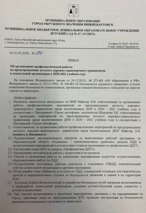 Приказ о назначении ответственным за работу по профилактике детского дорожно-транспортного травматизма в ДОО