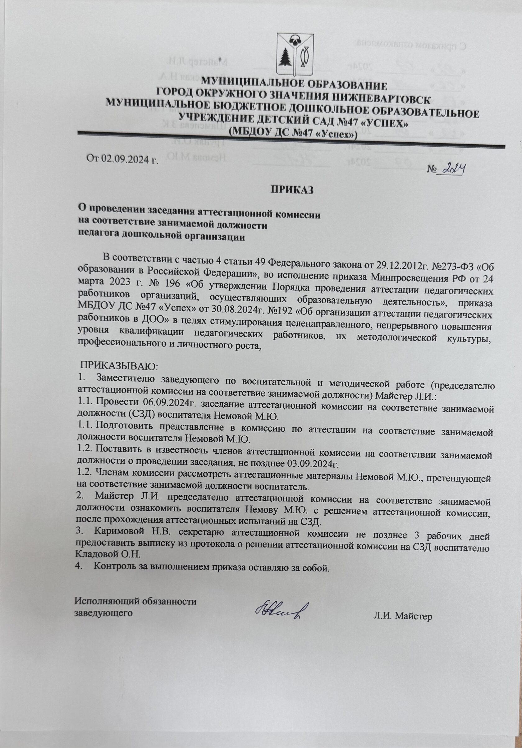 Приказ о проведении заседания аттестационной комиссии на соответствие занимаемой должности