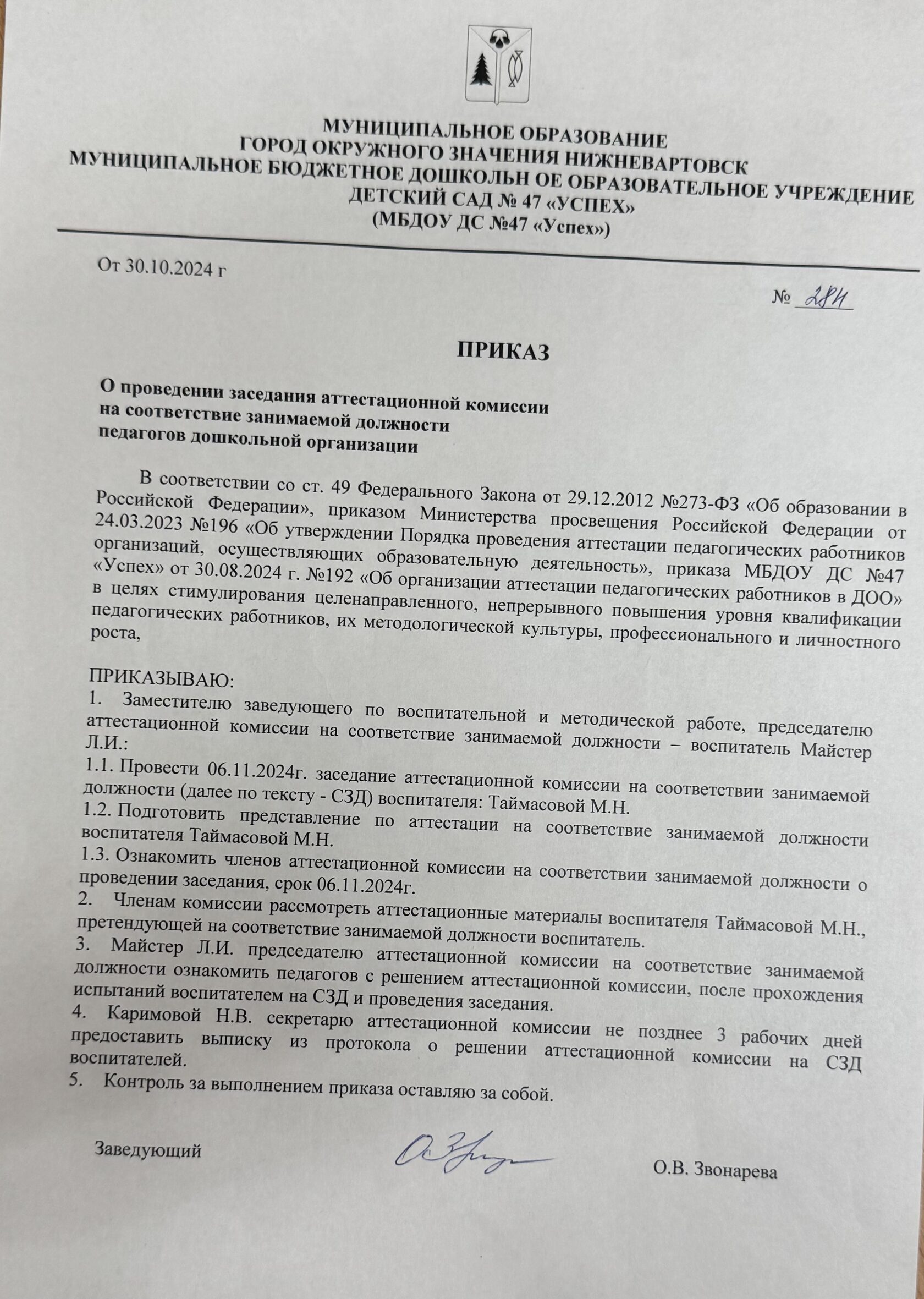 Приказ о создании комиссии о проведении заседания аттестационной комиссии на соответствии занимаемой должности